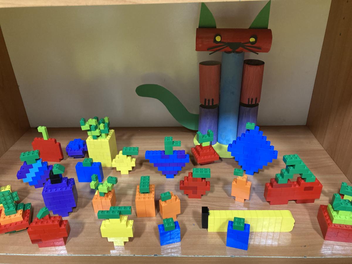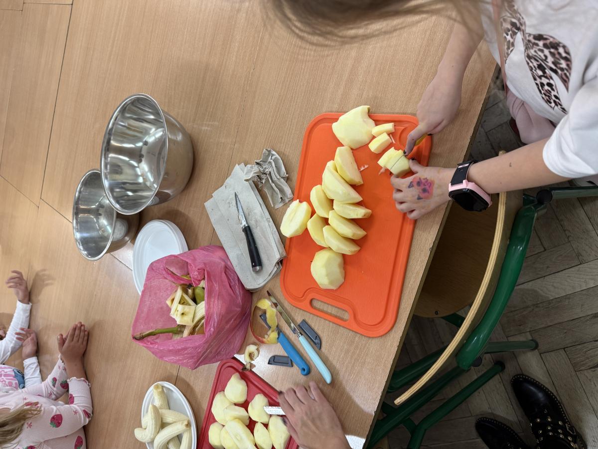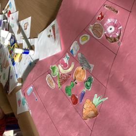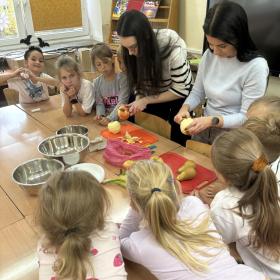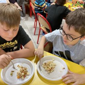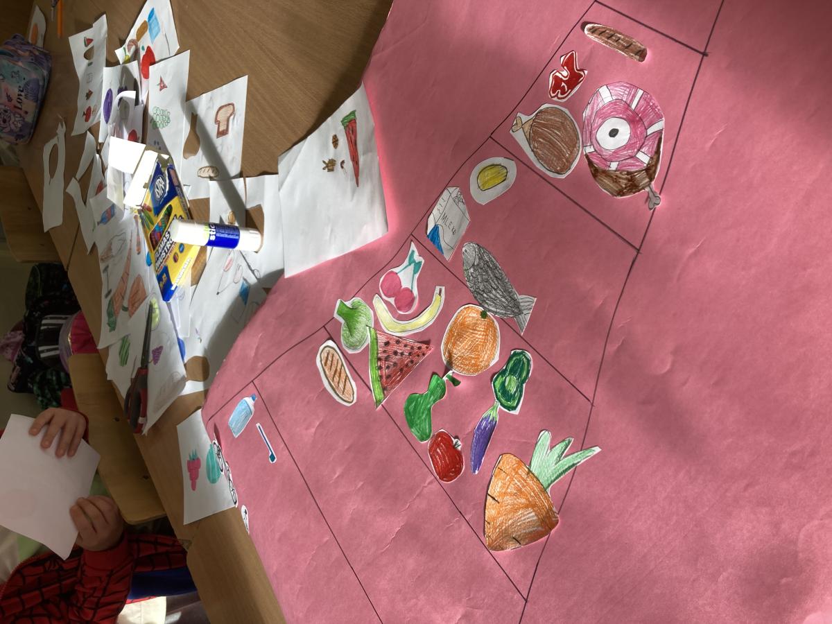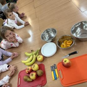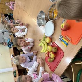 Wspólnie poznawaliśmy zasady zdrowego żywienia-rozmawialiśmy o tym co warto jeść,a czego unikać.Wspólnie wykonaliśmy piramidę zdrowego żywienia, dzieci oglądały filmy edukacyjne i śpiewały piosenki o zdrowych produktach.Nie zabrakło też praktyki-przygotowaliśmy pyszną sałatkę owocową .Analizowaliśmy składy produktów spożywanych przez dzieci. Nie zabrakło też zabaw i konkurencji sportowych z dynią. Z klocków Lego powstawały jagódki, marchewki, jabłka… i owoce, warzywa 3D z kartek bloku technicznego. Zdobyta wiedza na pewno będzie pomocna w komponowaniu codziennego menu. Serdecznie dziękujemy pani Kasi Tuz za owoce, z których mogliśmy tworzyć nasze kulinarne dzieło.