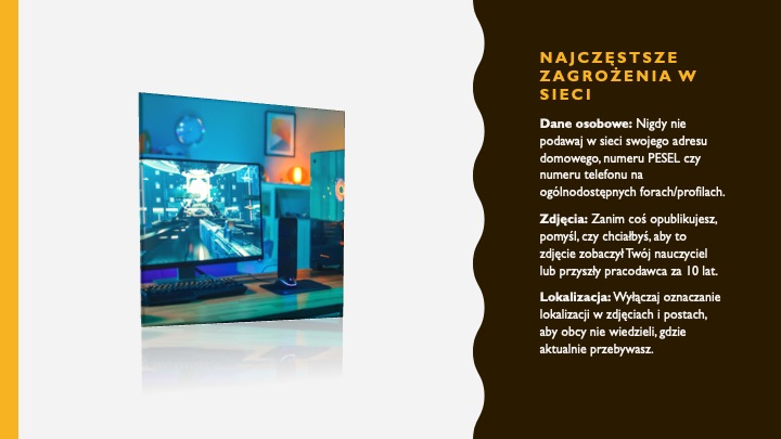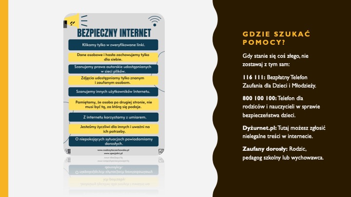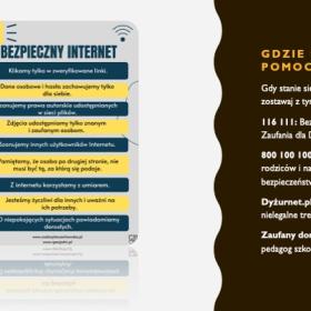 Jednym z zadań dla uczniów klas 4–8 było przygotowanie prezentacji dotyczącej bezpieczeństwa w Internecie. Uczniowie samodzielnie wyszukiwali informacje, opracowywali materiały oraz przygotowywali wskazówki, które mogą pomóc innym w bezpiecznym poruszaniu się w świecie online.