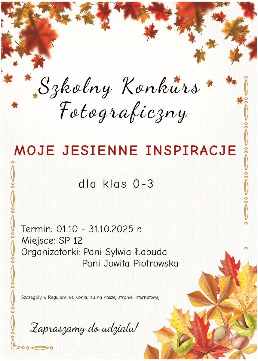 Opublikowano: 06.10.2025 Zapraszamy do udziału! Szczegóły w załączniku. Pliki do pobrania: konkurs-fotograficznyregulamin.pdf